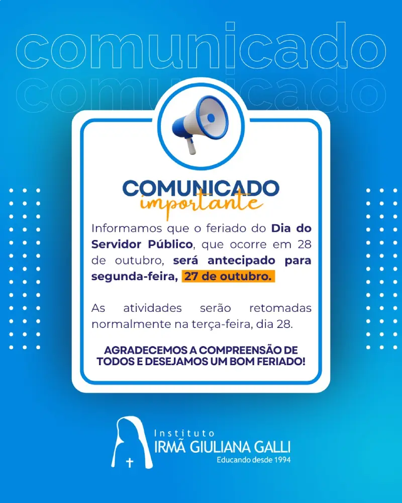 Informamos que na próxima segunda-feira, dia 27 de outubro, não haverá aula em razão do feriado do Dia do Servidor Público, antecipado do dia 28 para o dia 27.