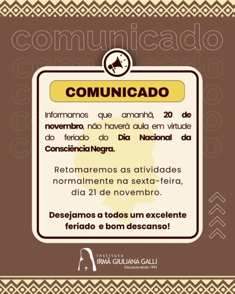Informamos que amanhã, 20 de novembro, não haverá aula em razão do feriado do Dia Nacional da Consciência Negra.