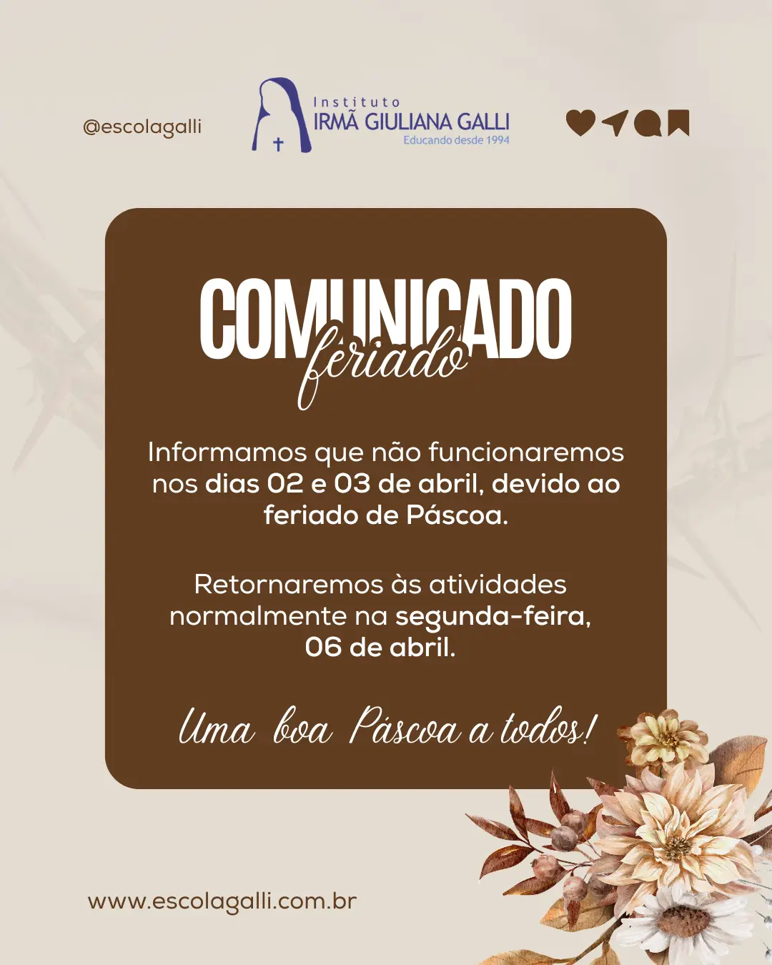 Comunicado de Feriado – Páscoa